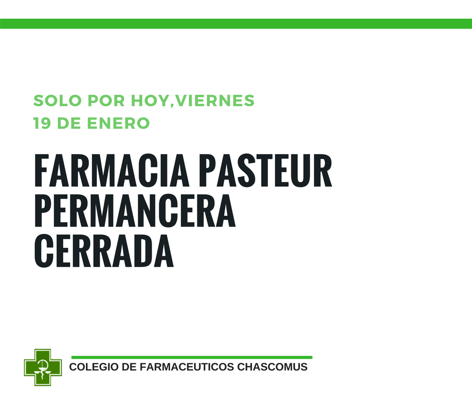 📢 Informamos que solo por hoy viernes 19 de enero, la farmacia Pasteur permancerá cerrada.