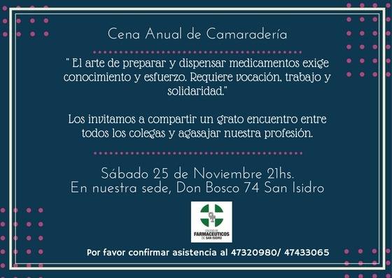 Cena Anual de CamaraderíaPor Carolina Lobo Poblet / noviembre 21, 2017 Sábado 25 de Noviembre 21hs en nuestra sede Don Bosco 74, San Isidro. Cena Anual