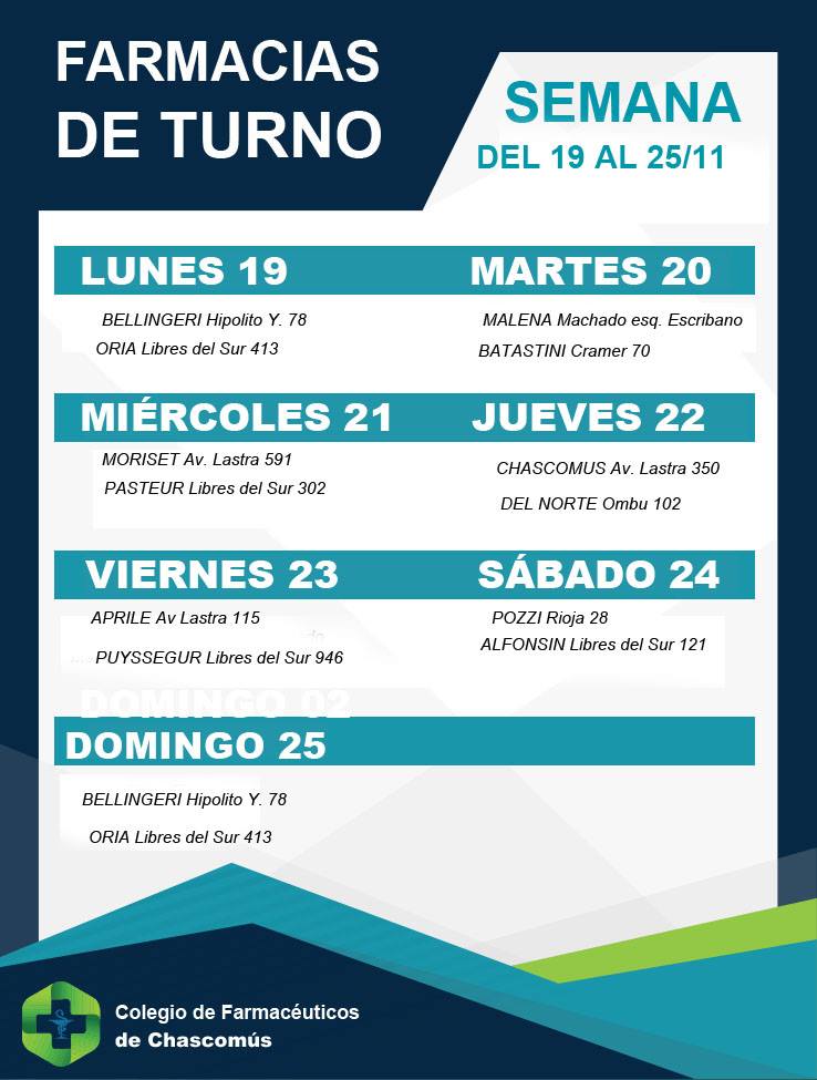 Farmacias de turno en Chascomús semana del 19 al 25 de noviembre Publicado el20 noviembre, 2018AutorPablo Fourquet