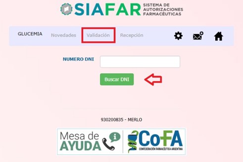 – A continuación, se debe hacer clic sobre el campo “Validación”, donde luego se deberá ingresar el Nro. De DNI del afiliado y hacer “Clic” en Buscar DNI: