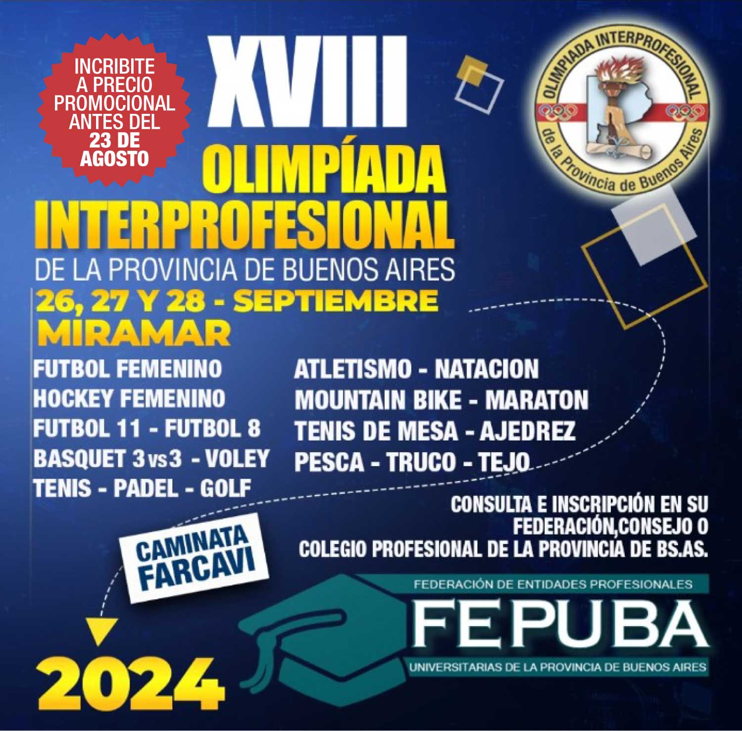 La Federación de Entidades de Profesionales Universitarios de la Provincia de Buenos Aires, abrió la inscripción para la XVIII Olimpiada Interprofesional, que tendrá lugar entre el 26 y el 28 de septiembre del corriente año en la ciudad de Miramar.