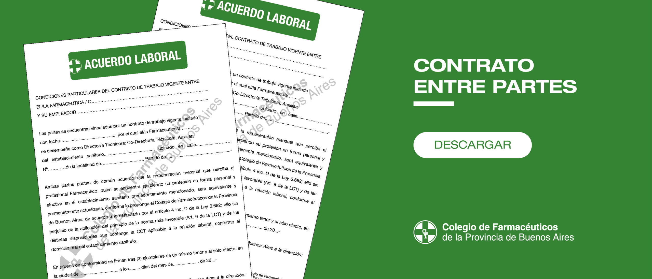 Contrato entre partesEl Contrato ENTRE PARTES, es un documento que puede utilizar cualquier colega en el sector privado, ya sea al comienzo de su relación laboral o durante la misma. El mismo, tiene por finalidad lograr un acuerdo entre empleado y empleador para que la remuneración mensual que perciba el profesional farmacéutico sea equivalente y permanentemente actualizada, conforme lo proponga el Colegio de Farmacéuticos de la Provincia de Buenos Aires, de acuerdo al art. 4 inciso D de la Ley 6.682 Por cualquier duda pueden escribir a asuntoslaborales@colfarma.org.arAdemás del contrato entre partes, en nuestra página web podrán encontrar distintas herramientas necesarias para resguardar las condiciones laborales adecuadas para el ejercicio profesional de los colegas en Relación de Dependencia y en Sociedad. Estas son: la solicitud de representación, la autorización para la presentación ante el Ministerio de Trabajo y la autorización para la presentación ante el Ministerio de Trabajo y el Ministerio de Salud. Desarrollaremos la mismas en los próximos boletines. |